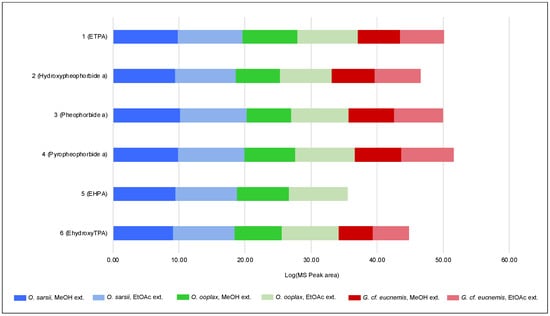 Log10 of the MS peak area (from UHPLC-HRMS/MS analysis) of the 6 isolated chlorins in the EtOAc and MeOH extracts of Ophiura sarsii, Ophiura ooplax, and Gorgonocephalus cf. eucnemis.