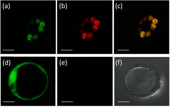 Protoplast isolation and transformation were performed as previously described [22,23]. After transformation, protoplasts were incubated for 24–48 h in the dark at 28 °C before imaging. Fluorescence was monitored using an Olympus FluoView 1000 confocal laser scanning microscope (Olympus, Tokyo, Japan) equipped with a set of filters capable of distinguishing between green and yellow fluorescent proteins (GFP and YFP, respectively) and plastid autofluorescence. The images were captured with a high-sensitivity photomultiplier tube detector.