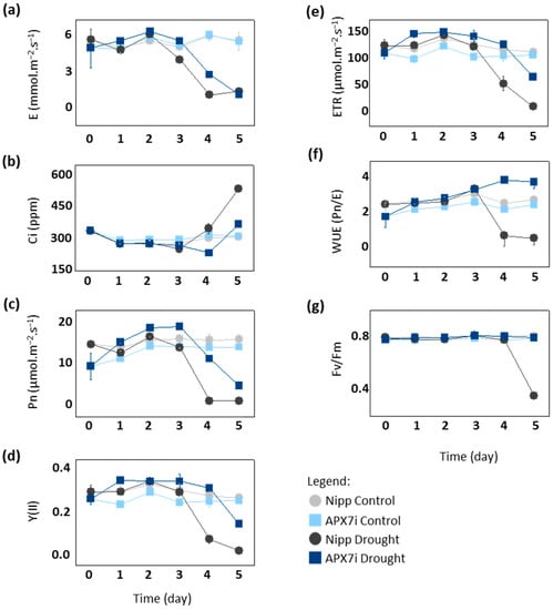 Photosynthetic and fluorescence parameters in plants subjected to drought stress. (a) transpiration, (b) intracellular CO2, (c) net photosynthesis, (d) quantum yield of photosystem II, (e) electron transport rate, (f) Water use efficiency, (g) Potential quantum use efficiency of photosynthesis (Fv/Fm) in Nipponbare (grey) and APX7i (blue) leaves. Light colors indicate the measurement in plants under control conditions. All values represent the media ± SE of at least three independent experiments.