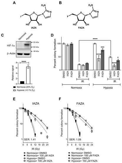 A promising strategy to target therapy-resistant hypoxic tumours is using hypoxia-activated prodrugs (HAPs; such as nitroimidazoles, NIs). These agents become selectively activated and accumulate only in hypoxic cells by bioreductive binding to the cellular macromolecules [7]. NIs preferentially affect hypoxic cell viability and often display hypoxia-selective radiosensitization potential in cell and animal models [8,9]. They have shown particular benefit in patients with head and neck tumours [10]; for example, addition of nimorazole (a 5-NI) to RT can improve treatment outcome in HNC patients with hypoxic tumours [11]. The present study is focused on two clinically validated 2-NI hypoxic radiotracers, iodoazomycin arabinofuranoside (IAZA) and fluoroazomycin arabinofuranoside (FAZA) (Figure 1A,B) [12,13,14]. Previously, we have shown that these compounds can selectively target hypoxic cells and induce cytostasis [15]. Additionally, their capacity to sensitize hypoxic human hepatocellular carcinoma and colorectal cancer cells to ionizing radiation (IR) has been reported elsewhere [16,17]. However, if and how IAZA and FAZA affect response of hypoxic HNC cells to IR is yet to be explored in detail.