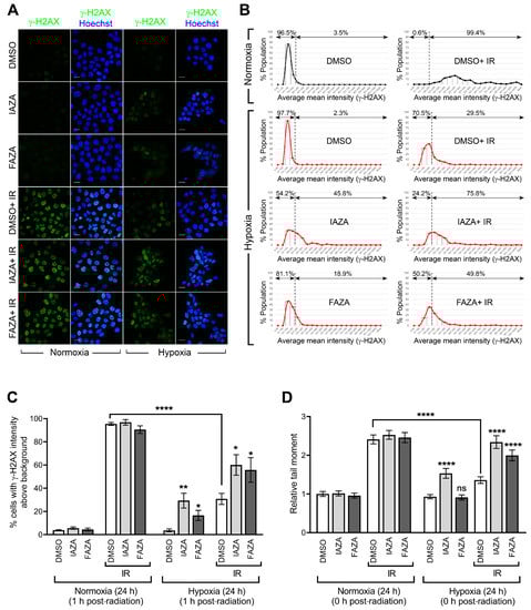 IAZA and FAZA increase DNA damage in hypoxic irradiated cells. To test if co-treatment of hypoxic cells with the drugs and IR increases DNA damage, we performed immunofluorescent staining for phosphorylated histone 2A (γ-H2AX) as a readout of DNA double-strand breaks. Irradiated hypoxic cells (5 Gy) showed a significant decrease in γ-H2AX-positive population when compared to their normoxic counterparts, confirming the resistance of hypoxic cells to IR (Figure 2A,B). Interestingly, IAZA treatment under hypoxia alone generated an increase in γ-H2AX-positive population similar to that seen in the hypoxic group treated with radiation only (~30%). Furthermore, combined treatment with IAZA and IR under hypoxia increased the γ-H2AX-positive population to ~60%. Hypoxic cells treated with FAZA alone and in combination with IR consisted of ~17% and 56% γ-H2AX-positive populations, respectively (Figure 2C). These observations were further validated by single-cell gel electrophoresis (alkaline comet assay), which directly measures the structural integrity of cellular DNA in the form of single-strand breaks and alkaline-labile sites. Radiation-induced DNA damage was significantly lower under hypoxia than normoxia, which was evident from a 50% reduction in comet tail moment seen in the hypoxic radiation treatment group (Figure 2D). In agreement with the γ-H2AX data, IAZA alone and in combination with IR showed a significant increase in comet tail moment, with the latter generating DNA damage levels similar to the irradiated normoxic cells. While FAZA alone under hypoxia did not generate any observable DNA damage in the comet assay, combination of FAZA with radiation under hypoxia also significantly increased DNA damage when compared to IR-treated hypoxic cells.