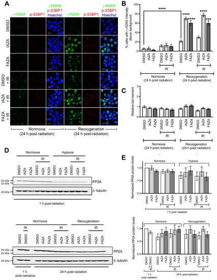 IAZA- and FAZA-treated hypoxic cells display high γ-H2AX staining following reoxygenation, but not a corresponding increase in DNA damage. To assess how IAZA- and FAZA-treated cells respond to exposure to oxygen after hypoxic incubation, drug-treated cells were allowed to reoxygenate for 24 h and stained for DNA damage markers, γ-H2AX, and phospho-53BP1 (a specific marker for DNA double-strand breaks). A marked increase in the percentage of cells positive for γ-H2AX was observed (Figure 3A,B). This effect was independent of radiation and only seen in drug-treated hypoxic cells that underwent reoxygenation. Qualitatively, these cells displayed a bright γ-H2AX signal, with a combination of punctate foci and pan-nuclear staining. Interestingly, phospho-53BP1 staining did not yield a similar response (Figure 3A), suggesting that the γ-H2AX signal was not exclusively due to DNA damage. Further confirmation for this finding came from the alkaline comet assay, where no change in comet tail moment was observed in the reoxygenated cells, regardless of the treatment conditions (Figure 3C). One possible explanation for the persistent γ-H2AX signal could be that treatment with IAZA and FAZA under hypoxia impaired cellular capacity to dephosphorylate γ-H2AX by reducing the cellular level of protein phosphatase 2A (PP2A), the enzyme primarily responsible for removing phosphorylation from H2A.X [27]. However, while hypoxia resulted in an overall reduction of total PP2A levels, no difference was observed among the various treatment combinations in the hypoxia group, regardless of whether cells were processed without any reoxygenation or after 24 h of reoxygenation (Figure 3D,E).