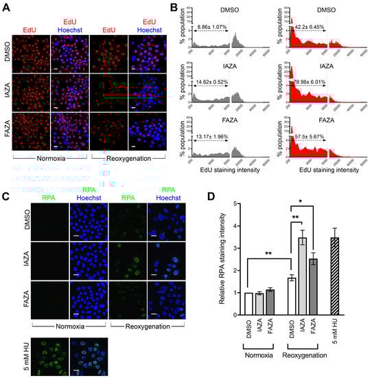 Hypoxic cells treated with IAZA and FAZA experience replication stress following reoxygenation. Since reoxygenated cells displayed a strong γ-H2AX signal but minimal DNA damage or reduced PP2A level, we wondered if these cells were experiencing anomalies in DNA synthesis, as replication stress can also lead to a pan-nuclear γ-H2AX signal [28]. To investigate this, drug-treated hypoxic cells were allowed to recover for 24 h in medium containing EdU, a nucleoside analogue that becomes incorporated into cellular DNA during replication. Overall, reoxygenated cells had lower EdU incorporation (Figure 4A,B), but it was significantly lower in drug-treated cells, suggesting IAZA- and FAZA-treated cells had impaired DNA replication capacities during reoxygenation. To further corroborate these observations, drug-treated reoxygenated cells were stained for replication protein A, which binds to single-stranded DNA generated as an intermediate from stalled replication forks [29]. Chromatin-bound RPA fraction is resistant to detergent extraction and, therefore, is indicative of the presence of single-stranded DNA and, by extension, of replication stress [30]. A significant increase in RPA-positive cells was observed in drug-treated cells in comparison to vehicle-treated cells upon reoxygenation; hydroxyurea-treated cells (24 h) served as positive control (Figure 4C,D).