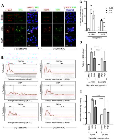 Reoxygenation in the presence of NAC reduced γ-H2AX and RPA-positive populations in drug-treated hypoxic cells. (A) Representative micrographs showing a reduction in γ-H2AX and RPA staining in response to NAC incubation during reoxygenation; scale bar = 20 µm. (B) Representative histograms showing quantification of γ-H2AX staining intensity; dotted line shows the threshold for background levels of γ-H2AX staining. (C) Percentage of γ-H2AX-positive population in hypoxia/reoxygenated cells treated with IAZA or FAZA (100 μM) was decreased in the NAC-treated group; data show mean ± S.E.M. from two independent replicates. Quantification of γ-H2AX (D) and RPA (E) staining intensity are shown; a minimum of 125 cells were analyzed for each condition.