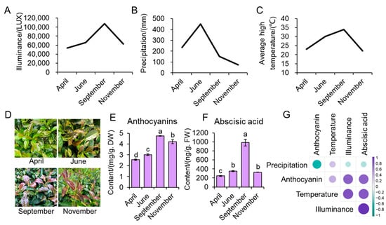 Changes in environmental factors in Wuyi Mountain tea plantation and young leaf color and anthocyanin and ABA content of ZFX1 plants over four seasons in 2020, which include mean illumination (A), precipitation (B), and temperature (C) as well as leaf color changes (D), anthocyanin (E) and ABA content (F), and correlation analysis of the factors with anthocyanin and ABA contents (G). The data in the graphs are mean values ± SD of three experimental replicates. Error bars are standard deviation of three samples (n = 3). Different letters above bars indicate significant differences among treatments analyzed by Duncan’s test at p < 0.05 level.