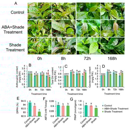 To further test the role of high–light triggered anthocyanin accumulation and leaf color changes, a shade experiment was conducted in spring with ZFX1 grown under 75% shade (a PPFD of 749 µmol m−2 s−1). The leaf color of plants treated with or without shade remained green, but shaded plants treated with ABA produced purplish colored leaves 168 h after the treatment (Figure 2A). The appearance of purple leaves was accompanied with an increased level of anthocyanin in 168 h (Figure 2B), but the anthocyanin contents in the other two treatments were significantly lower. The changes in coloration also affected total chlorophyll contents (Figure 2C) in 168 h and carotenoid contents (Figure 2D) 8 and 168 h after the treatments. We also analyzed the antioxidant abilities of leaves collected 168 h after treatments. The shading treatment reduced antioxidant activities of tea leaves analyzed by DPPH (Figure 2E) and ABTS (Figure 2), but antioxidant activities of leaves treated with shade and ABA were significantly higher than shade treatment only (Figure 2E) or comparable with the control (Figure 2G). These results indicated that even under reduced light level, ABA plays an important role in modulate anthocyanin biosynthesis.