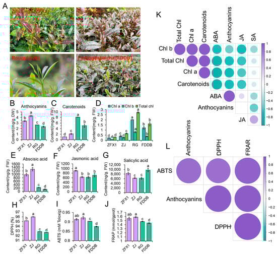 The close relationship between anthocyanin and ABA occurred in another purple leaved tea cultivar. Four tea cultivars ZFX1, ZJ, RG, and FDDB with purple, deep purple, green, and deep green leaves, respectively (A). Anthocyanin (B), carotenoid (C), chlorophyll (D), ABA (E), JA (F), and SA (G) contents in young leaves of four cultivars. Antioxidant activities of the young leaf extracts of the cultivars tested with DPPH (H), ABTS (I), and FDDB (J), respectively. Correlation analyses of the relationships among hormone and anthocyanin (K) as well as among antioxidant activities and anthocyanin (L). The data in the graphs are mean values ± SD of three experimental replicates. Error bars are standard deviation of three samples (n = 3). Different letters above bars indicate significant differences among treatments analyzed by Duncan’s test at p < 0.05 level.