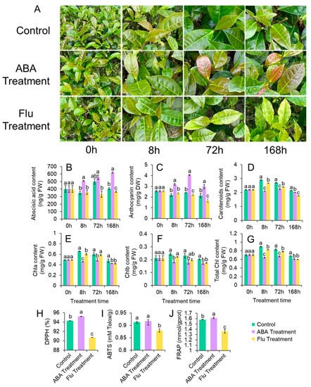 To further investigate the relationship between leaf color and ABA, tea leaves of ZFX1 plants were treated with ABA, Flu or deionized water in spring. Compared to the control (water treatment), leaves of ABA treated plants became purplish after 8 h treatment, and the purple color intensified thereafter (Figure 4A). On the other hand, leaves treated with Flu stayed in green, and some leaves exhibited reduced greenness. Compared with the control plants, ABA content in young leaves increased from 11.0% at 8 h to 52.5% at 168 h after ABA treatment (Figure 4B), while the ABA content in Flu-treated leaves significantly decreased by 34.6% compared to the control. Anthocyanin content started to increase after 8 h of ABA treatment and reached the maximum at 72 h (4.1 ± 0.06 mg/g DW), which was 1.69–fold higher than the control (Figure 4C). On the contrary, anthocyanin levels in Flu-treated leaves began to decrease at 72 h and reached the lowest level (1.7 ± 0.16 mg/g) by 168 h. Carotenoid content decreased significantly from 8 to 72 h after ABA treatment and returned to the control level at 168 h (Figure 4D). ABA treatment decreased total chlorophyll, chlorophyll a, and b contents (Figure 4E–G). Flu treatment generally decreases carotenoid and chlorophyll contents. Leaf samples collected at 128 h were used for evaluating antioxidant activities. The antioxidant activities determined by DPPH, ABTS, and FRAP (Figure 4H–J) methods increased significantly after ABA treatment compared to that of the control. The antioxidant activities of leaves treated with Flu were significantly lower than those treated with water or ABA.