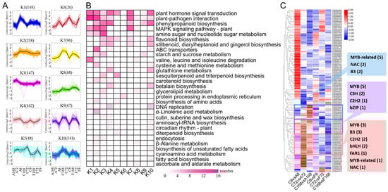 Global expression profile of transcripts in ZXF1 leaves treated with water (C), ABA (A) or Flu (F). k–Means cluster analysis grouped DEGs into 10 clusters (K1–K10) (A) where the x axis represents leaf samples collected after 8, 72, and 168 h of each treatment, the y-axis indicates the normalized FPKM, and numbers in parentheses represent DEG numbers within the mentioned cluster. KEGG analysis of 1341 DEGs in the 10 clusters (B). The expression pattern of transcription factors after water, ABA or Flu treatments (the number in the parenthesis is the number of genes highly expressed) (C).
