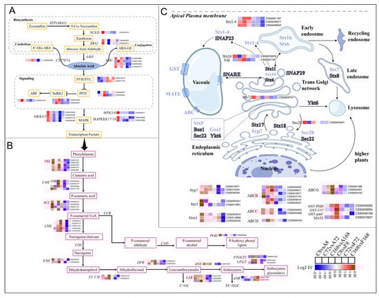 To understand the relationship between ABA signal and leaf coloration, transcripts of the DEGs involved in anthocyanin metabolism were compared between ABA and Flu treatments, which are presented via schematic illustration and heatmap insets (Figure 6B). All the major identified unigenes involved in the phenylpropanoid pathway, such as PAL, C4H, and 4CL were upregulated upon ABA treatment but downregulated after Flu treatment (Figure 6B). Similarly, all the anthocyanin biosynthetic pathway genes were upregulated in ABA treatment but downregulated in Flu treatment. Two genes, F3H and DFR, key to the anthocyanin biosynthesis were highly expressed with a log2 fold increase of 1.2 in 8 h and 168 h after ABA treatment, respectively. However, F3H had a log2 fold decrease in 3 h after Flu treatment. A key gene involved in the catechin pathway, ANR, was highly upregulated in response to Flu but downregulated after ABA treatment. In addition, specific genes for glycosylation modification of anthocyanins, UFGT, and F3GGT were found to be upregulated after ABA treatment, especially at the later stages of treatment (Figure 6B). After synthesis in the cytoplasm, anthocyanins must be transported to the vacuole for storage and accumulation [,]. DEGs identified and annotated as a group of genes related to SNARE–domain family of transporter proteins, such as Stx5,7,16 (syntaxin), Sec20, and Syp7, were upregulated in response to the ABA treatment but downregulated after Flu treatment (Figure 6C). The syntaxin genes (Stx1–4), usually found in apical plasma membrane, were also upregulated after ABA treatment. Other proteins associated with anthocyanin transport including ABC family of transporter proteins and GSTs transporter were also increasingly expressed by exogenous ABA activation (Figure 6C).