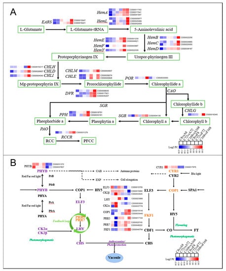 An illustration of DEGs involved in chlorophyll metabolism and light signaling after ZXF1 leaves treated with water, ABA or Flu. DEGs resulting from ABA or Flu treatments versus control treatment are presented in color code boxes based on log2 fold changes. (A) The DEGs involved in chlorophyll metabolism included CHLI magnesium chelatase subunit I, CHLM magnesium–prot–porphyrin O–methyltransferase, CAO chlorophyllide an oxygenase; HEMF coproporphyrinogen III oxidase, DVR divinyl chlorophyllide an 8–vinyl–reductase, POR protochlorophyllide reductase, and CHLD chlorophyll/bacteriochlorophyll a. (B) The DEGs involved in light signaling included CK2α, casein kinase II subunit alpha; COP1, constitutive photomorphogenic; CRY1/2, cryptochrome; ELF3, early flowering 3; FKF1, flavin-binding kelch domain F box protein; FT, flowering locus T; HY5, elongated hypocotyl 5; PHYA/B, phytochrome; PRR5/7, pseudo response regulator 5/7; and SPA, suppressor of PHYA.