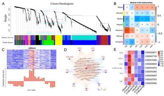 A weighted–gene co–expression network established in ZXF1 leaves after treating with water, ABA or Flu. (A) Hierarchical cluster dendrogram constructed by WGCNA, on which each leaf represents a gene. Seven merged modules (based on a threshold of 0.20) identified by weighted-gene co–expression network. (B) Module–trait associations based on Pearson correlations. Each row represents one module, and the gene numbers in each module are shown on the far left. Each column corresponds to one metabolite. (C) Expression pattern of genes in MEsalmon. (D) Gene co-expression network for the MEsalmon module. All of the 85 genes in this module were used to construct the co–expression network and were visualized by Cytoscape 3.8.2 software. The purple triangles and red circle represent the key hub genes. (E) Heatmap of salmon module TF family in different treatment groups. The TF family from ABA and Flu treatment versus control contrasts are presented in color code boxes based on log2 fold changes.