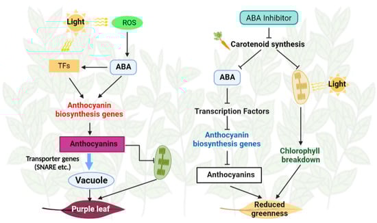 High light has been reported to trigger anthocyanin biosynthesis []. When light intensity exceeds the plant’s ability to use or dissipate the energy, excess light produces ROS that can impair a photosynthetic apparatus, resulting in reduced photosynthetic activities. In the meantime, ROS also trigger plants to synthesize anthocyanins to reduce the severity of photooxidative damage []. Anthocyanins have been shown to contribute substantially to H2O2 scavenging as compared to other phenols []. Additionally, anthocyanin accumulation in the fruit skin is correlated with plant hormones [,]. Notably, ABA has been confirmed to be a major regulator of anthocyanin synthesis in non-climacteric fruits (e.g., strawberry, grapes, and bilberry) [,,]. Studies on the dynamic transcriptional landscape under a high light without heat stress showed that Arabidopsis seedling activated ABA synthesis after 6 h exposed to the high light followed by the induction of anthocyanin accumulation, and during which ABA receptor were downregulated after high light treatment []. In tea plant production, light has been shown to increase anthocyanin content in the dark-purple tea cultivar ‘Ziyan’ (Camellia sinensis) []. ABA is also associated with anthocyanin accumulation during tea plant growth and development. When Chen et al. compared the expression of MYBs between purple and green-leaved teas, the authors found that the expression of CsMYB17 was prominent in the purple leaves, and such an expression level was also evident in leaves treated with exogenous application of 100 μM ABA [].