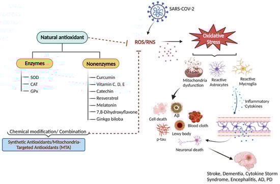 There is still no cure for the neurological sequelae of COVID-19. During acute COVID-19, patients have been treated with corticosteroids, antibiotics, and antiviral drugs [1]. Antioxidants are attracting scientific interest in the therapy and prevention of COVID-induced neuronal damage [4,28]. Examples of antioxidants include vitamins C, E and D, curcumin, quercetin, melatonin, and rosmarinic acid [4,7,28,29,30,31,32,33,34]. These molecules have advantages in counteracting the oxidative-stress effects by scavenging ROS, combating the cytokine storm, and providing neuroprotection, as summarized in Figure 1.