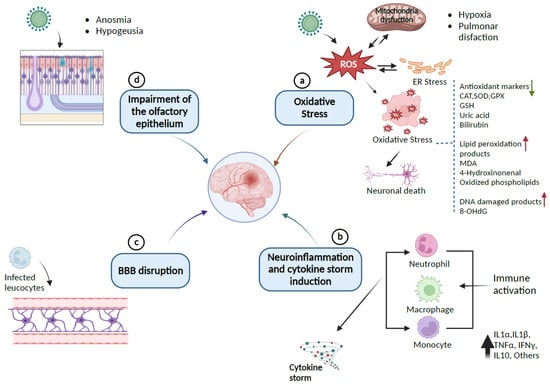 Pathway of SARS-CoV-2-induced neurological damages: (a) SARS-CoV-2 provokes the release of ROS, which leads to endoplasmic reticulum stress (ER) or oxidative stress that can damage lipids, proteins, and DNA biomolecules in the cells and can downregulate the expression of antioxidant proteins CAT, SOD, GPx, GSH, and the levels of uric acid and bilirubin as causative factors for neuronal cell death. (b) Immune response to inflammation triggers inflammatory markers involving cytokines and chemokines that can initiate cytokine storm syndrome. (c) Infected leukocytes can infect the central nervous system by crossing and disrupting the BBB. (d) SARS-CoV-2 enters the CNS through the olfactory epithelium, which expresses the ACE2 receptor. The resulting infection causes neuronal death and olfactory dysfunction. Up and down arrows indicate the upregulation and downregulation of biomarkers, respectively (Created with BioRender).