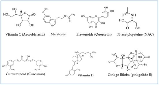 Here, we highlight some therapeutic agents that may significantly help to ameliorate long-term-COVID conditions. Amongst these are antioxidant compounds or agents endowed with antioxidant properties (Figure 3). They have demonstrated an improved prognosis of COVID-19 patients via different mechanisms, mainly by reducing inflammation [28,51]. In many cases, these compounds share multiple mechanisms of action, which may render them more efficient in exerting broad-spectrum protective effects. In a synergic fashion, their neuroprotective properties may be enhanced by complementation with antioxidants with different mechanisms of action. Most antioxidant compounds are molecules from natural sources or of dietary origin (nutraceuticals). In the latter case, a balanced diet and supplementation with proper nutrients can contribute to the prevention, treatment, and management of COVID-19 and its associated neurological sequelae.