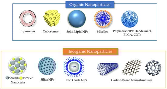 Inorganic nanoparticles are primarily known for their use in diagnostic and theranostic applications. Iron oxide nanoparticles (IONPs) are one type of inorganic NPs that has been extensively employed for therapeutic and diagnostic imaging since the 1960s. Gold nanoparticles (AuNPs) have been widely studied due to their biocompatibility and the ease of controlling their size distribution and shape. AuNPs can take a variety of shapes, including spheres, nanorods, and cubes, among others. Other inorganic nanoparticles are nanoceria, silica nanoparticles (SiNPs), particularly mesoporous silica nanoparticles (MSNPs), and iron oxide NPs [63,64,65] (Figure 4).