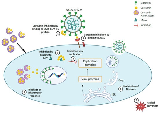 Proposed therapeutic mechanism for curcumin-loaded nanosystems in accordance with literature findings [67,68]. (1), (2), and (3) Curcumin nanocarriers inhibit SARS-CoV-2 by delivery of curcumin to bind to the S protein, ACE2 receptor, and Mpro of the coronavirus, thereby (4) impeding the virus replication complex. (5) Curcumin nanocarriers can also block inflammatory response by (6) modulating ER stress and (7) scavenging ROS. (Created with BioRender).