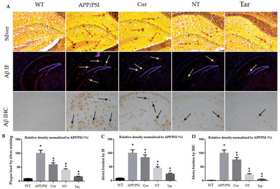 Capacity of Cur-loaded PLGA-PEG-B6 nanoparticles to decrease hippocampal Aβ burden in APP/PS1 mice. The AD animal model (APP/PS1) received saline, free Cur drug, PLGA-PEG/Cur nanoparticles (NT), and PLGA-PEG-B6/Cur nanoparticles (Tar), after which (A) Bielschowsky silver staining (red arrows) and immunofluorescence (IF, white arrows) or immunohistochemistry (IHC, black arrows) of Aβ in brain sections were performed. (B–D) The relative density of Aβ plaque in each group was compared using silver staining, Aβ IF, and Aβ ICH, respectively. The experimental findings show Aβ plaque deposition in APP/PS1 animals compared with wild-type mice. The Cur and NT groups experienced a marginal reduction, whereas the Tar group showed the most substantial reduction in Aβ plaques. (* p < 0.05; # p < 0.05) Adapted with permission from [76] under Open Access Creative Commons Attribution License. Copyright {2018} Informa UK Limited (Taylor & Francis Group).