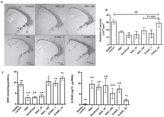 A dendrimer-based therapy (D-NAC) for neuroinflammation and cerebral palsy (CP) was developed using NAC as a drug [92]. In this work, newborn babies with CP were randomly administered with NAC at concentrations of 10 mg/kg (NAC_10), 100 mg/kg (NAC_100), D-NAC of 1 mg/kg (D-NAC_1), D-NAC of 10 mg/kg (DNAC_10), dendrimer alone (control), or PBS (negative control). Confocal microscopy results (Figure 7) showed a decrease in myelin basic protein (MBP) staining in the corona radiata, internal capsule, and external capsule following day 5 of life in endotoxin kits treated with PBS compared with healthy controls. A significant increase in myelin staining equivalent to the expression levels of healthy controls was seen in the kits treated with D-NAC at 10 mg/kg (D-NAC_10). In contrast, free antioxidants at a concentration of even 100 mg/kg (NAC_100) were less effective than D-NAC_10. Markers of oxidative injury in the brain’s periventricular region (PVR) were used to identify oxidative injury and inflammation. After therapy, the amounts of 8-hydroxyguanosine (8-OHG) and GSH were assessed in healthy and CP rabbits. The treatment of the CP kits with D-NAC 1, D-NAC 10, and the highest dose of free medication (NAC 100) resulted in a rise in the GSH levels as compared with those of the healthy control kits. However, treatment with NAC_10 and dendrimer alone had no impact. This fact suggests that NAC is released from the brain’s dendrimer conjugate. Even at the highest dose, D-NAC 10 significantly decreased the levels of 8-hydroxyguanosine (8-OHG), an early and sensitive marker for RNA oxidation in various neurodegenerative diseases [92]. The treatment with D-NAC (10 mg/kg) nanosystem significantly enhanced the number of neurons as compared with the healthy controls.