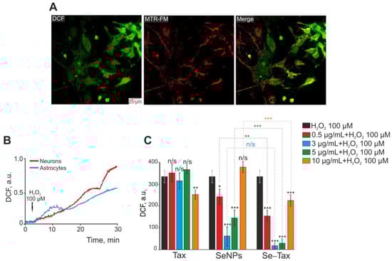 Taxifolin (TAX), selenium nanoparticles (SeNPs), and selenium–taxifolin nanocomplex (Se–TAX) pretreatments of cerebral cortex cells for 24 h have a dose-dependent impact on ROS generation induced by 100 μM H2O2. (A) Confocal fluorescence images with simultaneous labeling of cerebral cortex cells with a DCF probe (to quantify ROS generation), a mitochondrial probe (MitoTracker Red FM, MTR-FM), or a combination image (Merge). (B) Generation of ROS in cerebral cortex neurons (red curve) and astrocytes (blue curve) after adding 100 μM H2O2 to the cell culture. (C) Impact of TAX, SeNPs, and Se–TAX, at varying doses, on the H2O2-induced ROS generation after 24 h cell incubation (measurements performed using a microplate reader). Adapted with permission from [97]. (*** p < 0.001; ** p < 0.01 and * p < 0.05. n/s—insignificant differences). Copyright {2022} Science-HHS Public Access (PubMedCentral).