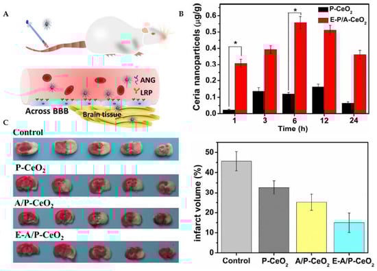 Ceria nanoparticles for neuroprotection against stroke and BBB disruption. E-A/P-CeO2 and A/P-CeO2, ceria nanoparticles loaded with or without edaravone and modified with Angiopep-2 (ANG) and polyethylene glycol (PEG) on their surface; P-CeO2, ceria NPs decorated with PEG. (A) Schematic representation of the Angiopep-2 (ANG-targeting) of lipoprotein receptor-related peptide (LRP) on the brain capillary endothelial cells (BCECs) that promote E-A/P-CeO2 crossing the BBB into brain tissue for the treatment of stroke. (B) Cerebral uptake of ceria nanoparticles was conducted on healthy rats whose BBB was complete. ICP-OES was used to measure the concentrations of ceria nanoparticles in brain tissue following intravenous injection. E-A/P-CeO2 nanoparticles were successfully carried across the BBB into the brain by an ANG-targeting and LRP-receptor-driven transcytosis mechanism in vivo. The results in Panel B demonstrate the accumulation of ceria NPs in the brain region within 24 h compared with P-CeO2 (* p < 0.05). (C) A model of stroke, middle cerebral artery occlusion (MCAO), was injected with different concentrations of ceria nanoparticles. Cerebral infarct volume was measured after 24 h by triphenyl tetrazolium chloride (TTC) staining. The normal stained tissue is red, and the unstained infarction is white. The result shows a high infarct volume of the control group of saline injection by 45.6 ± 4.8%. In contrast, treatment with E-A/P-CeO2 caused a decrease in infarction up to 15.0 ± 4.1% at an optimal concentration of 0.6 mg/kg in a dose-dependent manner. The neuroprotective effect of ceria nanoparticles indicates that E-A/P-CeO2 is more potent than A/P-CeO2 and P-CeO2, suggesting that edaravone attenuates ROS scavenging coupled with a targeted effect, thanks to the ceria core system which enhanced the antioxidant potency for improved treatment in vivo. Adapted with permission from [112]. Copyright {2018} American Chemical Society.
