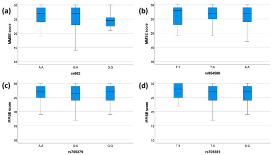 MMSE scores for each genotype. The box plots display the 5-, 25-, 50-, 75-, and 95-percentage intervals for the genotypes (a) rs662, (b) rs854560, (c) rs705379, and (d) rs705381. The medians (interquartile ranges) are displayed above each box plot. MMSE: mini mental state examination. For (a), N (AA) = 75, N (GA) = 51, N (GG) = 11. For (b), N (TT) = 18, N (TA) = 61, N (AA) = 58. For (c), N (AA) = 37, N (GA) = 55, N (GG) = 45. For (d), N (TT) = 14, N (TC) = 42, N (CC) = 81.