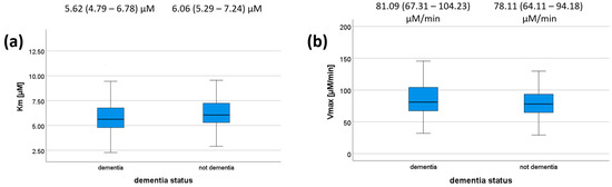 Km (a) and Vmax (b) values according to dementia status. The 5-, 25-, 50-, 75-, and 95-percentage intervals are shown. The medians (interquartile ranges) are displayed above each box plot. For (a), N (dementia) = 112, N (not dementia) = 82. For (b), N (dementia) = 96, N (not dementia) = 63.