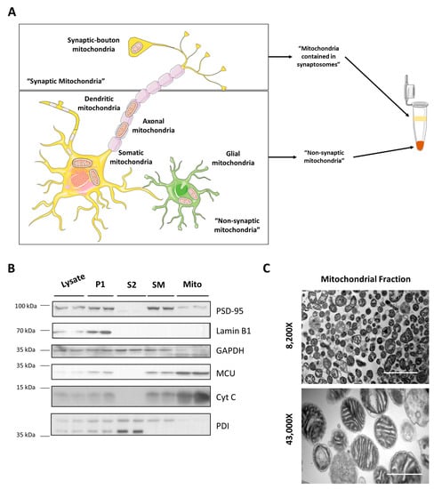 Mitochondrial isolation. (A) Scheme of mitochondrial distribution in the brain cells. (B) Immunoblot assessment of isolation protocol. It shows total lysate, first precipitant (P1), second supernatant (S2), synaptosomes + myelin after Percoll gradient (SM), and mitochondrial pellet (Mito). It shows synaptosomal marker PSD95, nuclear marker lamin B1, cytosolic marker GAPDH, two mitochondrial markers MCU and Cyt C, and endoplasmic reticulum marker PDI. (C) Electron microscopy of mitochondrial fraction seen at 8200× and 43,000×. Upper image scale bar 3.0 μm. Lower image scale bar 0.6 μm.