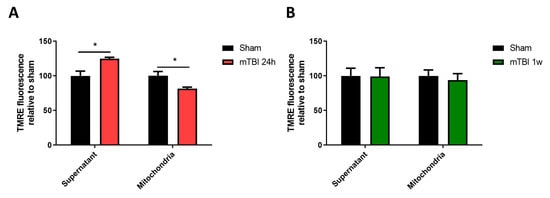 Then, we indirectly evaluated the mitochondrial membrane potential of the isolated mitochondria derived from our sham or mTBI-submitted mice. To do this, we used the exclusion of the positively charged dye tetramethylrhodamine (TMRE). As we have previously published, there was cognitive impairment one week after the mTBI protocol [30]. So, we evaluated mitochondrial membrane potential at this point, and we did not observe differences between experimental groups (Figure 2A) (TMRE in the supernatant, unpaired two-tailed t-test t = 0.04425, p = 0.9659; TMRE in mitochondrial pellet, unpaired two-tailed t-test t = 0.4725, p = 0.6509; sham n = 4, mTBI n = 5). Since other studies have suggested that mitochondrial bioenergetic impairment occurs early [18,19] in mTBI pathophysiology, we decided to evaluate 24 h after the mTBI protocol. We observed a decrease in TMRE signal in the mitochondrial fraction with a consistent increase in the supernatant, suggesting decreased mitochondrial membrane potential (Figure 2B) (TMRE in the supernatant, unpaired two-tailed t-test t = 3.083, p = 0.0177; TMRE in mitochondrial pellet, unpaired two-tailed t-test t = 3.580, p = 0.0373; sham n = 5, mTBI n = 4).