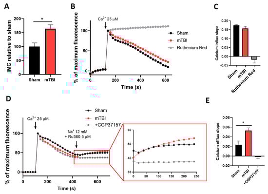 mTBI induces calcium overload and increased calcium efflux. (A) IMC relative to sham levels was measured spectrophotometrically. n = 4 for sham and 3 for mTBI. (B) Mitochondrial calcium uptake in isolated mitochondria measuring extramitochondrial calcium with impermeable sensor Calcium Green-5N. (C) Slope quantification of B. n = 4. (D) Mitochondrial calcium uptake and efflux measured fluorometrically as performed in B. The red square indicates the magnification of efflux curves. (E) Slope quantification of D. n = 3. Student’s t-test for IMC and slopes. * p < 0.05.