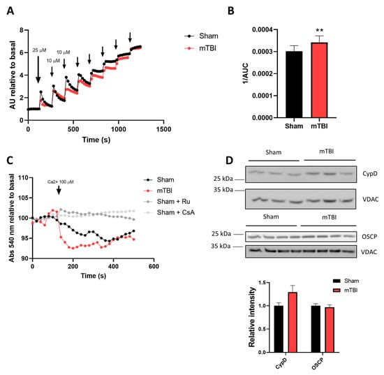 mTBI increases calcium retention capacity. (A) Calcium retention capacity (CRC). Isolated mitochondria were submitted to several calcium challenges starting with 25 μM, and then 10 μM stimuli. (B) The CRC was quantified as the inverse of the area under the curve of the entire register. n = 4. (C) Swelling assay. Isolated mitochondria were stimulated with 100 μM calcium and followed spectrophotometrically at 540 nm. When indicated, ruthenium red 10 μM or cyclosporine A 1 μM was used. n = 3. (D) Immunoblot analysis for two proteins involved in mPTP opening: CypD (n = 3) and OSCP (n = 4). Student’s t-test for 1/AUC and immunoblots; two-way ANOVA, and Bonferroni post hoc analysis for swelling assay. ** p < 0.01.