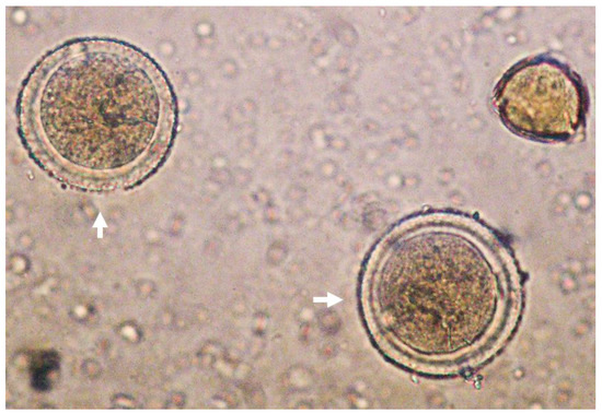 Representative picture of Persea spp. pollen (white arrows) under light microscope (40×).