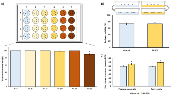 The effect on embryonic development and viability of AH was evaluated through the embryotoxicity test reported by Luo et al. (2019) with several modifications [20]. Briefly, N2-embryos were isolated and placed in NGM plates with E. coli OP50 and 100 mg/mL of AH or vehicle. After 24 h, larvae were scored using a microscope (Motic Inc., LTD. Hong Kong, China). Results are presented as the mean of the relation between larvae found and the number of embryos dispensed from three independent experiments with, at least, 50 embryos per treatment.