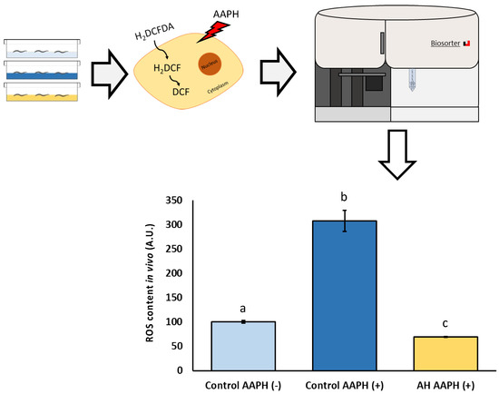 Schematic and analytical representation of the antioxidant analysis of AH against AAPH-induced oxidative stress in C. elegans. Results are mean ± SEM. Different lowercase letters means statistically significant differences (p < 0.05).