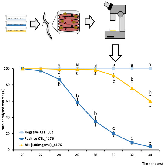 Schematic and analytical representation of the cytoprotective analysis of AH against amyloid-β-induced toxicity in C. elegans. Results are mean ± SEM. For each time, different lowercase letters means statistically significant differences between experimental groups (p < 0.05).