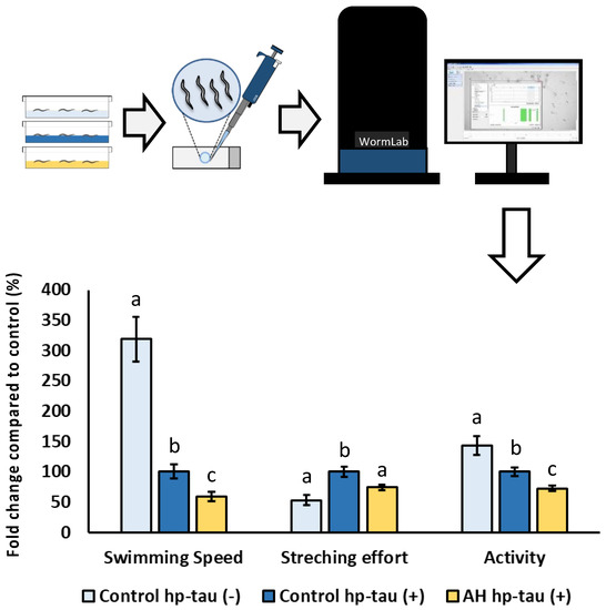 Schematic and analytical representation of the cytoprotective analysis of AH against behavioral changes related to tau protein-induced neurotoxicity in C. elegans. Results are mean ± SEM. For each parameter, different lowercase letters mean statistically significant differences (p < 0.05).