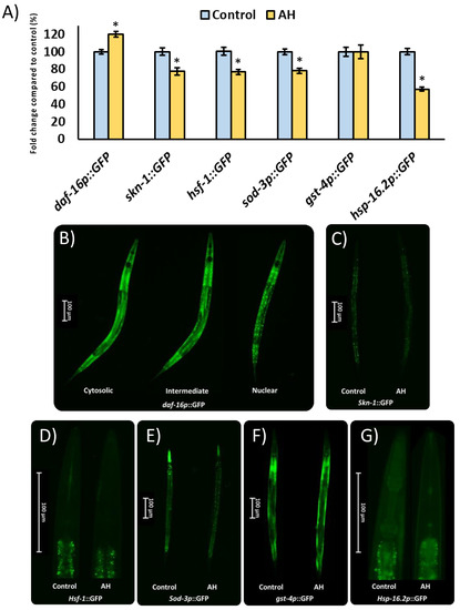 Influence of AH 100mg/mL on gene expression reported by GFP transgenic strains. (A) Fluorescence intensity quantification in the specific GFP-reporter strains. (B) Representative pictures of the semi-quantitative distribution of daf-16p::GPG status. (C) Representative pictures for skn-1::GFP expression for both groups. (D) Representative pictures for hsf-1::GFP expression for both groups. (E) Representative pictures for sod-3p::GFP expression for both groups. (F) Representative pictures for gst-4p::GFP expression for both groups. (G) Representative pictures for hsp-16.2p::GFP expression for both groups. Results are mean ± SEM. Asterisk (*) means statistically significant differences (p < 0.05) against the control of the same strain.