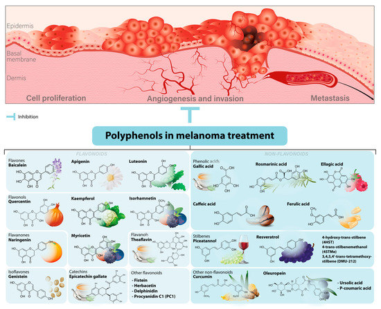 Nutritional interventions are becoming a standard in cancer care and prevention, with multiple studies indicating their importance and impact on prognosis and response to treatment. Multiple polyphenols widely available in vegetables and fruits have demonstrated a clear anticancer effect in melanoma, highlighting the importance of research on nutrition-based intervention as novel cancer treatment and prevention approaches [158]. In vitro and in vivo studies have proven the potential role of polyphenols as anticancer treatments in melanoma, either as individual molecules or associated with the currently available therapeutic approaches. Currently, there are no clinical trials enrolled on clinicaltrials.gov that analyze the effect of polyphenols as an anticancer drug or adjuvant in melanoma. Still, two clinical trials, NCT03950635 and NCT04645680, are investigating nutrition’s role in managing melanoma patients. These clinical trials investigate if by using nutritional interventions, we can influence the prognosis of melanoma patients or if the effect of nutrition on the microbiota can enhance the response to immunotherapy drugs. Clinical trials that focus on nutritional interventions are a promising start for the field, which indicate that soon polyphenols will pave their way to the clinic.