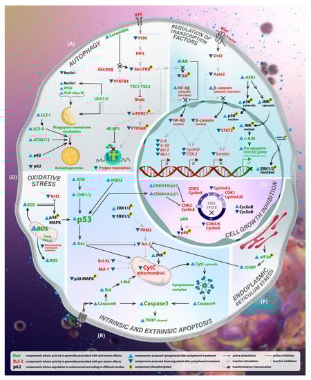 Proposed mechanisms of action of polyphenols in melanoma initiation. Polyphenols treatment of melanoma cells results in the regulation of several signaling transduction pathways. Here are depicted possible networks of cellular processes regarding melanoma initiation regulated by polyphenols, based on results from described aforementioned studies. Note that different studies demonstrated that polyphenol regulation of specific molecules, such as ERK1/2 and p38 MAPK, presented controversial results in melanoma cells. (A) Autophagy. PI3K/Akt/mTORC is one of the main autophagy pathways found downregulated by polyphenols. Consequently, autophagosome formation is initiated through ULK1/2, Beclin1, and ATG upregulation, which results in cellular content degradation. Additionally, mTORC downregulation leads to a halt of protein translation through the regulation of 4E-BP1 and P70S6K. (B) Transcription factors regulation. Polyphenols can negatively regulate the transcription of oncogenes, such as Bcl-2, Mcl-1, or Survivin, through the downregulation of certain transcription factors. For example, translocation of β-catenin in the nucleus is inhibited via downregulation of the Wnt pathway. A decrease in levels of phosphorylated Akt can contribute to transcription regulation through the inactivation of transcription factor NF-κb. Transcription of proapoptotic genes, such as TP53, PUMA, or Bax, can also be regulated by polyphenols via the upregulation of kinases, such as JNK, which in turn phosphorylates and activates transcription factors. (C) Cell growth inhibition. Many studies demonstrated the positive effect of polyphenols upon cell cycle arrest in melanoma cells. After polyphenols treatments, cell cycle regulators such as Cyclins are found to be downregulated, and inhibitors of cyclins, such as p21 and p27, are found to be upregulated. (D) Oxidative stress. Polyphenol treatment showed to increase ROS levels in cytosol. Consequently, it dysregulates more cellular processes and activates apoptosis in response to oxidative stress. (E) Apoptosis. Polyphenols influence the intrinsic pathway of apoptosis in many different ways, one of the most important being the upregulation of tumor suppressor protein p53. As a result, the release of cytochrome C in cytosol and activation of caspases 9 and 3 occur. A significant role is assigned to increased BCL-2/BAX ratio after polyphenol treatment, being independently confirmed by different studies. The extrinsic pathway is also influenced by polyphenols via positive regulation of extracellular signals, such as Fas/FasL, and finally via upregulation of caspases 8 and 3. A substantial increase in caspase 3 levels leads to enzymatic degradation of cellular content and cellular death. (F) Reticulum endoplasmic stress. Polyphenols can provoke endoplasmic reticulum stress, which negatively affects BCL-2 regulation and advantages the intrinsic pathway of apoptosis.