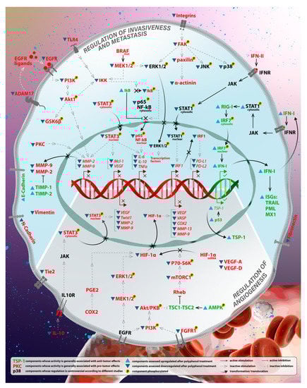 Proposed mechanisms of action of polyphenols in melanoma progression. In melanoma, polyphenols treatment of cells leads to the modulation of several signaling transduction pathways. Here are presented possible networks of cellular processes regarding melanoma progression, based on obtained results from described aforementioned studies. Note that some studies showed controversial results regarding the regulation of specific molecules, such as STAT1. (1) Regulation of invasiveness and metastasis. Polyphenols have shown to inhibit tumor progression through modulation of the immune system. For example, levels of inflammatory-related components, such as IL-6, IL-10, TNFα, PD-L1, or PD-L2, are found to decrease after polyphenols treatment via regulation of transcription factors (STAT1, STAT3, or NF-κb). Polyphenols are also involved in negative regulation of the EMT program, contributing to MMPs downregulation through PI3K/Akt or PKC pathways and suppression of vimentin, α-actinin, and fibronectin expressions, thus compromising cell motility. (2) Inhibition of angiogenesis. Polyphenols acted as positive regulators of antiangiogenic factors. One of the most essential angiogenic components is HIF-1α, which is found downregulated via several different pathways, such as PI3K/Akt or MAPK pathways. As a result, angiogenic factors (ex. VEGF-A, VEGF-D, VASP) are suppressed, contrarily with antiangiogenic factors, such as TSP-1.