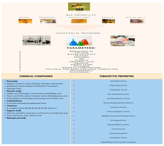 Honey is a natural product produced by bees. It has been used since ancient times as a food and in various therapeutic applications. It contains several chemical components beneficial to human health, which depend to a large extent on the botanical origin of the plants and the geographical area. Moreover, those two characteristics are used for certification and authenticity. Thus, a significant variability is observed in the physicochemical properties of honey, such as the moisture, pH, free acidity, and electrical conductivity, as well as the content of chemical substances such as organic acids, proteins, amino acids, vitamins, and phenolic compounds. For many years, honey and other beekeeping products such as propolis, pollen, royal jelly, bee venom, and wax have been recognized as bioactive products, with their therapeutic effects extending to a wide range of diseases and infections by pathogens, parasites, and viruses. The action of honey and beekeeping products is mainly due to antioxidant, anti-inflammatory, and immunomodulation factors [1,2,3,4,5,6,7]. Figure 1 illustrates several of the primary bee products and the most prevalent flavonoids and phenolic compounds available in honey and other bee products. The principal therapeutic properties from the respective bioactive compounds are also documented. Variability of the chemical composition and synthesis should be considered due to honey and honey products’ varied botanical and geographical origins [8,9,10,11,12,13,14,15,16,17,18].
