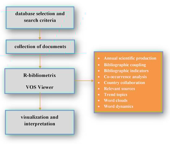 Moreover, the obtained manuscripts were recorded in the Microsoft Excel program by year, subject area, document type, and institutional affiliation. Visual depiction of keywords plus was also realized in this bibliometric research, and specifically, word dynamics and word trends of keywords plus are illustrated. The VOS Viewer program was applied to visualize the results and create a bibliographic map. We performed a co-authorship analysis using the full counting method, assigning the same weight to each co-authorship link. The full counting method was further used in the co-occurrence analysis of the keywords in the manuscript title, abstract, and text. The bibliometric analysis was developed by executing the following steps: research criteria, study questions, and analysis approach selection (the year, subject area, document type, institutional affiliation, keyword analysis, network of authors, research evolution); bibliometric data selection and analysis using the bibliometric software; and through generating networks, visualization figures, and interpretation of the results (Figure 2).
