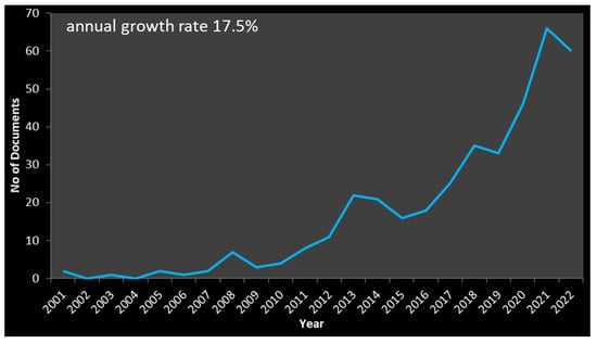 Figure 3 illustrates the annual production of documents. The number of published manuscripts represents a plausible assessment of the trends in a specific research domain. Publications were categorized by year, uncovering that the first manuscript appeared in 2001; however, an exponential growth in the produced articles was seen after 2009 (Figure 3). The highest number of manuscripts (68) was published in 2022. The annual growth rate was 17.5%. Furthermore, the yearly publication graph shows that researchers started paying attention to honey’s antimicrobial and antioxidant properties and various issues in 2011. The scientific interest is evident, because there has been an exponential increase in published documents since 2011.