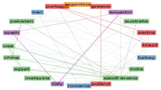 Global collaborations, networks, and research streams among countries are illustrated in the following figure. Figure 5 represents a clustered network of countries’ collaborations in a circular shape. The thickness of the lines is proportional to the number of collaborations between countries. Moreover, collaboration between two countries resulted from the co-authorship of authors from two different countries. Thus, the network node size is proportional to the number of publications in that country. In addition, the number of countries illustrated is twenty. In the current bibliometric analyses, single-authored documents totaled 22, co-authors per manuscript came to five, while international co-authorships amounted to 26.63%.