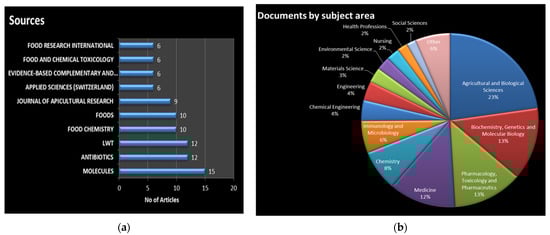 The above scientific journals have a high scientific impact and cover various multidisciplinary research topics. In particular, the lowest citation score was 3.2 (2021) for Evidence-based Complementary and Alternative Medicine, and the highest was 13.1 (2021) for the journal Food Chemistry. The many research areas of these sources include organic chemistry, medicinal chemistry, natural products, natural antibiotics, bee management, and advances in research into antibiotics and related bioactive therapeutic agents.