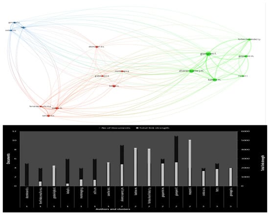 Figure 7 illustrates the network of authors and the number of documents based on bibliographic coupling. The principle of the bibliographic coupling method is the exploitation of the cited documents shared between papers for building relationships and generating a network of authors, documents, institutions, and countries. Thus, bibliographic coupling considers citations, to reveal similarities between items, such as two documents, authors, institutions, or countries [62]. Bibliographic coupling can be considered a measure of intellectual relatedness and research frontier composition [63,64].