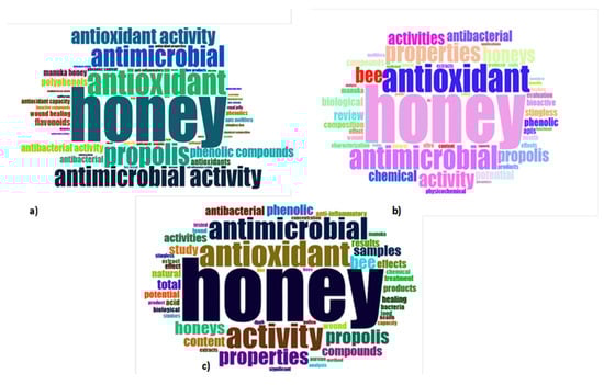 The above word clouds show that the most frequent keywords occurred more than ten times in titles, abstracts, and keywords. There was a high level of similarity among the most frequent words: honey, antimicrobial, antioxidant, bee, propolis, and phenolic compounds. “Pollen”, “wound”, “antibacterial”, “anti-inflammatory”, “chemical”, “polyphenols”, and “manuka honey” were also words that appeared in the collected manuscripts. As expected, the search keywords antimicrobial, antioxidant, honey; the respective stemming terms; and their derivatives prevailed in the word clouds.