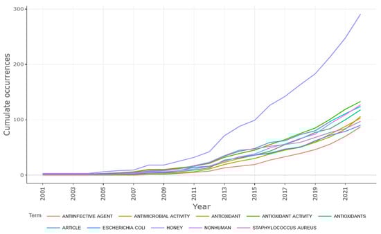 The dynamics of ten keywords since 2001 are represented in Figure 9. The specific terms are ranked in ascending order: “honey, antioxidant activity, nonhuman, article, antioxidants, antioxidant, antimicrobial activity, Staphylococcus aureus, Eschericia coli, and anti-infective agent”.