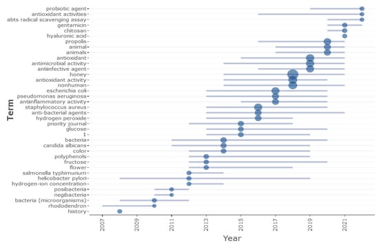 Selecting keywords plus one can reveal the main topics and research trends. As a result of the trend topic analysis, it was observed that the research on honey’s antimicrobial and antioxidant activity mainly concentrated on antioxidants, pathogens (E. coli, S. aureus and P. aeruginosa), anti-infective, and chemical agents, as well as on propolis [42,79] (Figure 10).